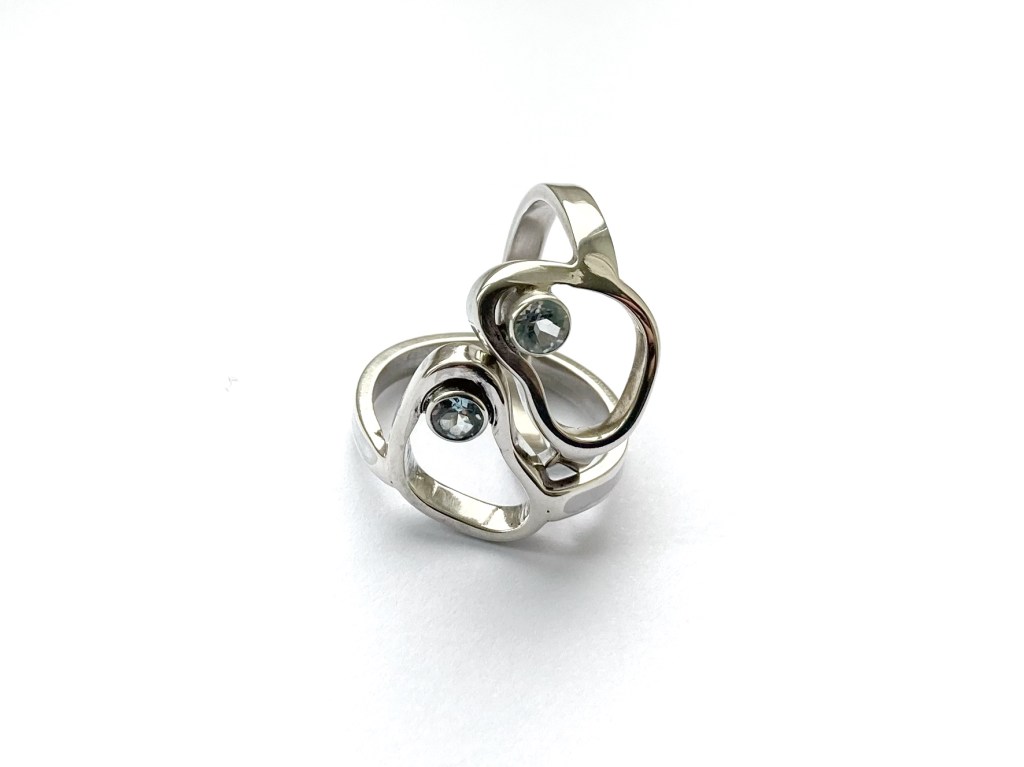 De afgezaagde krullen bleven me intrigeren… Wat zou er gebeuren als ik een krul dicht en rond zou buigen? Na het buigen en aan elkaar solderen, was ik verrast door de vorm die ontstond. Het werd geen cirkel, maar een vrije hartvorm. Ik werd er blij en enthousiast van. Dit moest een ring worden, een bijzondere hartenring met een topaassteentje erin. Na uren schuren en vijlen ontstond er iets unieks.