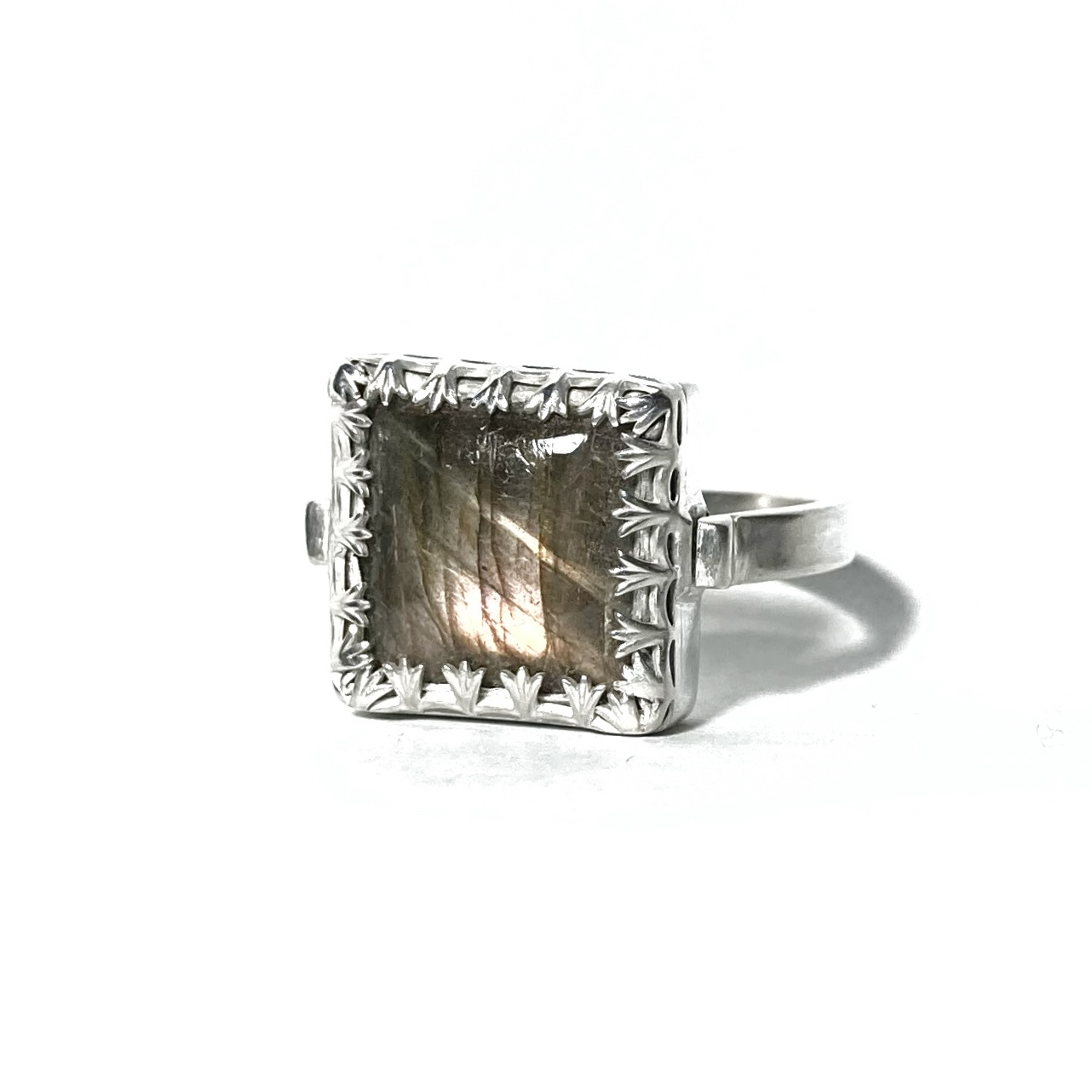 De vierkante labradorietsteen heeft lang moeten wachten op het juiste ontwerp. Een zetkastje, maar met wat voor rand? Mijn eerste idee was iets organisch, maar dat deed geen recht aan de prachtige steen. Een gladde band dan? Mmmm… eerst maar eens een kastje maken. Al snel bleek dat de hoogte en zijkant van de steen om een stevigere zetband vroegen, met een opvallende rand. Uiteindelijk kreeg de zetkast een dubbele wand met een elegante galerijrand rondom de steen. De ringband sluit daar strak tegenaan en maakt het ontwerp helemaal af.