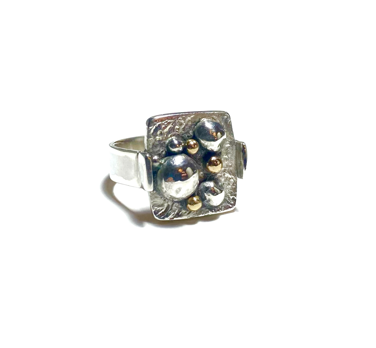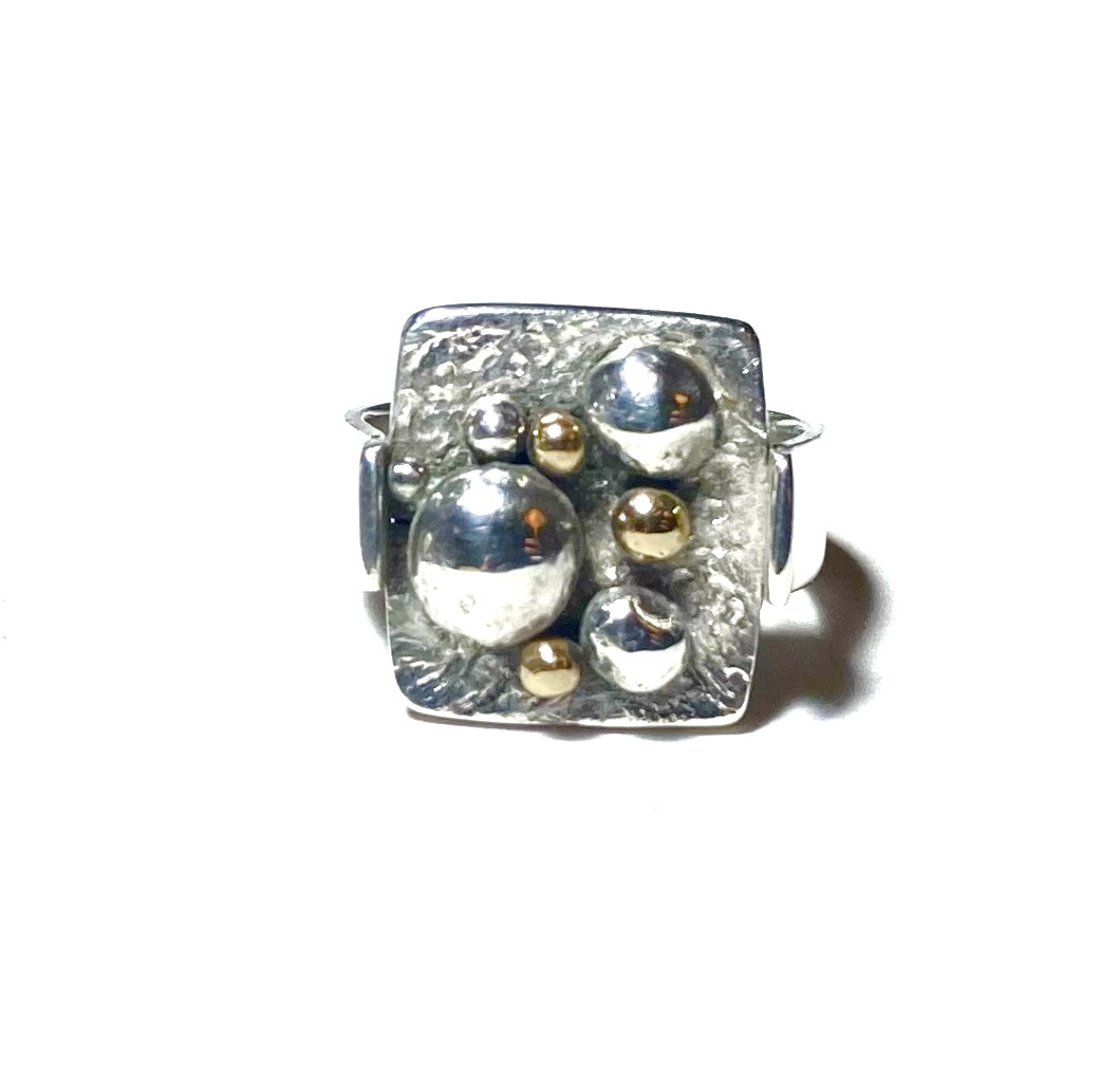 Voor deze laatste creatie liet ik me inspireren door mijn allereerste ervaring met sieraden maken. Ik had nog wat restjes goud liggen, perfect om kleine bolletjes van te smelten. In combinatie met hergebruikt zilver is dit het resultaat geworden: een gerecyclede ring van goud en zilver.