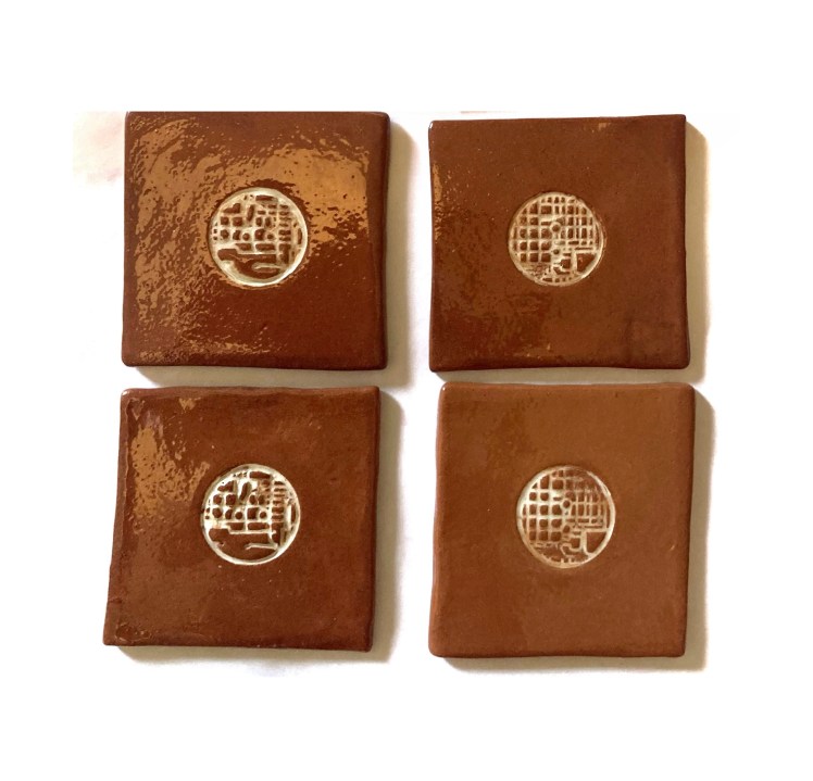 Onderzetters, gemaakt met de houten knoopjes van “stukje Kalamata”. De Marina en onze buurt.