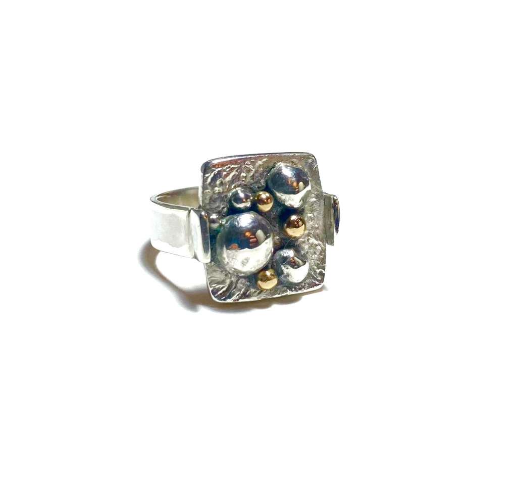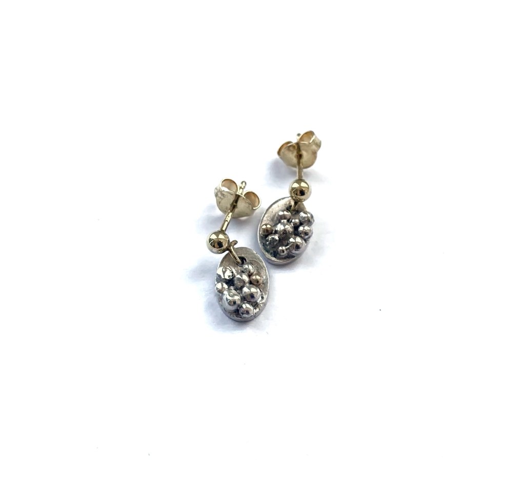 Mijn eerste uniek sieraad. Oud goud omgesmolten tot ballen op bewerkte zilveren plaat.